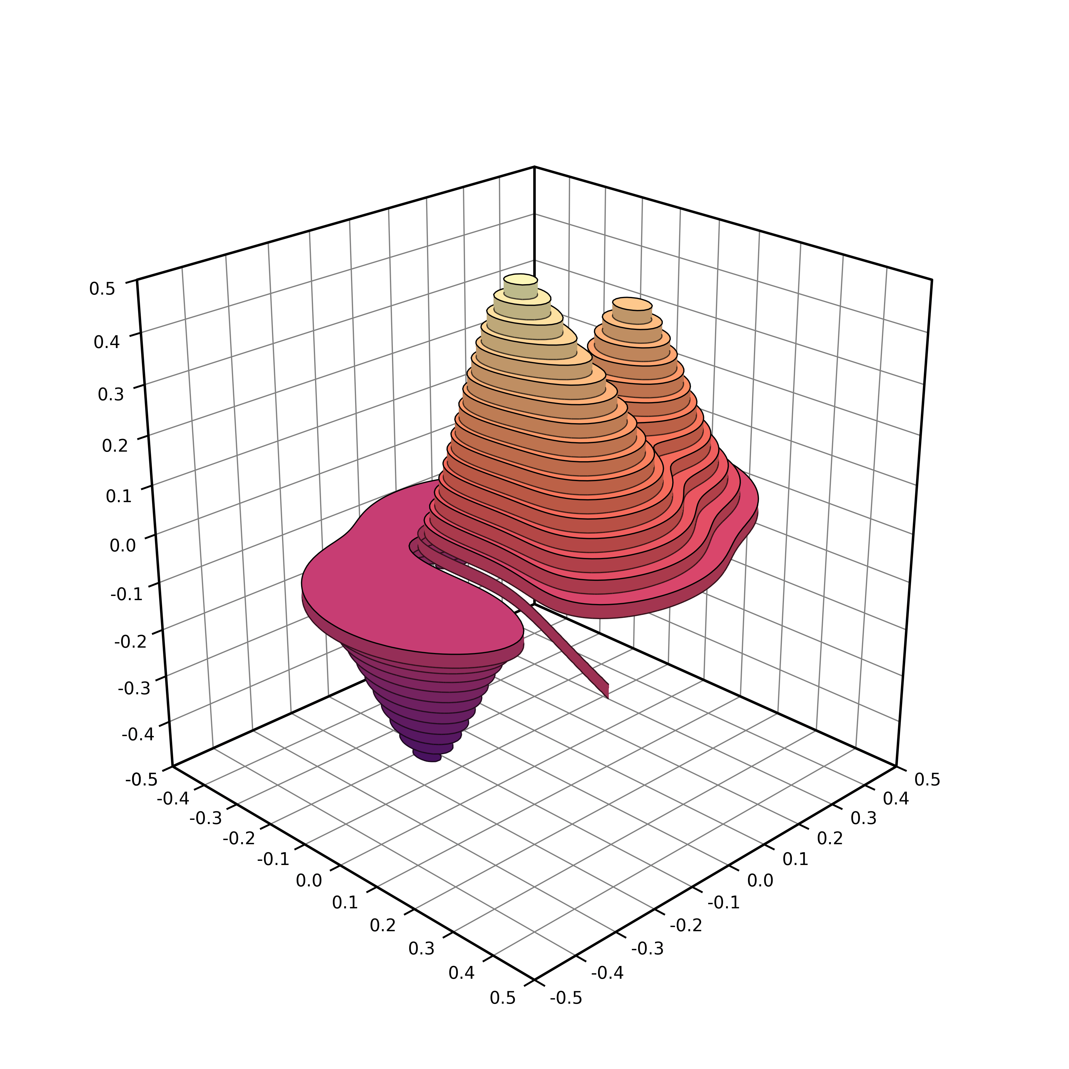 Let’s add some colors using the depth buffer. We’ll color each triangle according to it depth. The beauty of the PolyCollection object is that you can specify the color of each of the triangle using a NumPy array, so let’s just do that:
